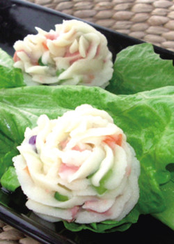 主料:嫩黃瓜,土豆,人造蟹肉(熟),櫻桃小番加 調(diào)料:鹽,雞精,糖,美奶滋醬 做法: 1、黃瓜,蟹肉切; 2、土豆連皮煮熟;浸入冷水中冷卻;去皮切。 3、將步驟1,2中所有材料放入有蓋的大號(hào)保鮮盒密封,進(jìn)冰箱冷藏2小時(shí)備用; 4、上桌前加入調(diào)料,再蓋上蓋子搖動(dòng)拌勻;取出裝盤,小番加對(duì)切裝飾即可。