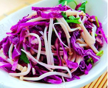 金針菇中含鋅量比較高,有促進(jìn)兒童智力發(fā)育和健腦的作用,在許多國(guó)家被譽(yù)為“益智菇”和“增智菇”。經(jīng)常食用金針菇,不僅可以預(yù)防和治療肝臟病及胃、腸道潰瘍,而且也適合高血壓患者、肥胖者和中老年人食用,這主要是因?yàn)樗且环N高鉀低鈉食品。金針菇可抑制血脂升高,降 涼拌不會(huì)破壞金針菇的營(yíng)養(yǎng)價(jià)值,能有效將金針菇的營(yíng)養(yǎng)價(jià)值發(fā)揮出來(lái)。家里還有半個(gè)紫甘藍(lán),就與金針菇一起拌著吃了,拌好后菜的顏色對(duì)比很大,紫色中夾著白色,又放了一點(diǎn)香菜,菜菜的顏色很養(yǎng)眼漂亮。