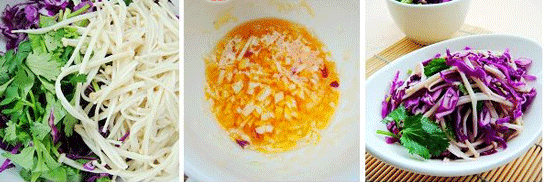 原料:金針菇、紫甘藍(lán)、香菜、鹽、香油、辣椒油、大蒜、白醋、生抽。 做法: 1、金針菇洗凈,放開(kāi)水鍋里焯水后瀝干水份備用; 2、紫甘藍(lán)洗凈切絲,香菜洗凈切碎,大蒜切末; 3、把金針菇、紫甘藍(lán)和香菜放盆中; 4、把大蒜末、白醋、香油、鹽、辣椒油和少許生抽放小碗中攪拌均勻,倒入放有金針菇等菜的盆中攪拌均勻即可。