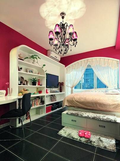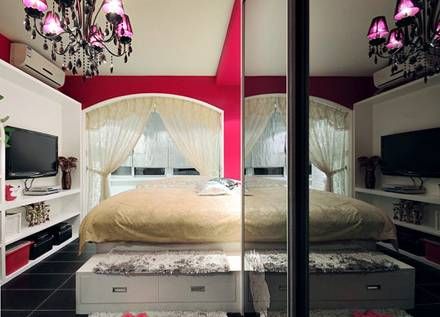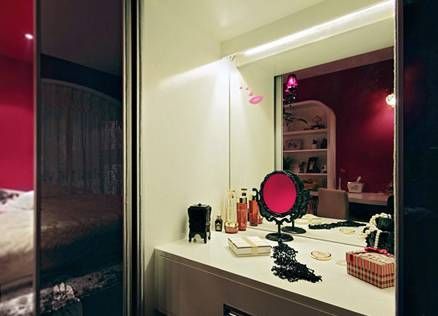 梳妝臺,艷紅的鏡子增添幾分香艷味道。