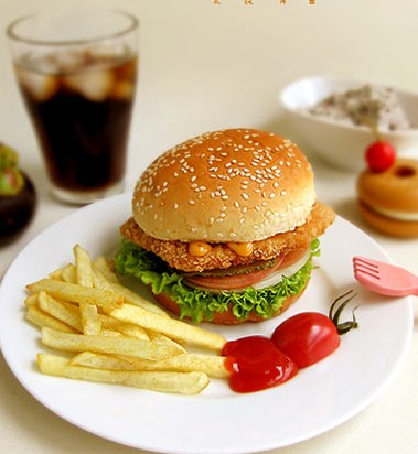 原料: A:水、黃油、糖、鹽、高粉、奶粉、干酵母。 B:蛋液少許、白芝麻。 C:牛肉餅、生菜適量、芝士片1 片、番茄1 個(gè)(切片)。 做法: 1、把所有A材料按照上面排列的順序放入面包機(jī),不讓干酵母碰到水; 2、選Dough鍵,Start。面包機(jī)可以幫助完成到基本發(fā)酵; 3、把面團(tuán)拿出來(lái),壓出空氣。分成4份,塑形; 4、烤箱里下層放熱水,上層放面團(tuán)。關(guān)起門來(lái)繼續(xù)發(fā)酵; 5、面團(tuán)發(fā)到2倍大,取出來(lái),表面刷上蛋液,撒上白芝麻; 6、烤箱預(yù)熱350oF,烤10-15分鐘?竞煤笕〕錾岳鋮s; 7、鍋中放少許油,把漢堡肉放進(jìn)去,煎5、6分鐘翻面,再煎5、6分鐘至熟; 8、漢堡面包切開,放上生菜、漢堡牛肉餅、芝士、番茄。開吃。嘴巴得張很大才能咬下~ |