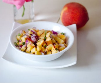 桃子1個(gè)(不是那種毛桃子。。、紅洋蔥1/3個(gè)、羅勒葉2-3片、蘋果醋、橄欖油。