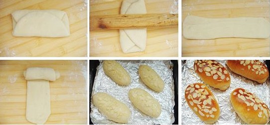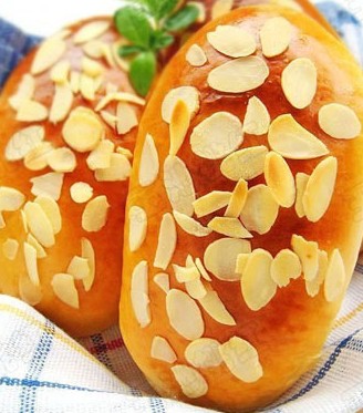 原料:高粉200g、白砂糖20g、雞蛋1個(留1/4刷面包表面)、牛奶120g、酵母2g、黃油20g、杏仁片適量。 做法: 1、原料中除黃油外所有材料揉勻至完全階段,可拉出透明薄膜。蓋保鮮膜至溫暖處發(fā)酵至2.5倍大; 2、面團取出排氣,分成四份,滾圓,蓋保鮮膜餳發(fā)20分鐘; 3、取一份,搟成牛舌狀,從上至下卷起。稍微滾長一點。依次做好四個; 4、排入烤盤,放溫暖濕潤處發(fā)至2倍大。取出刷蛋液,撒杏仁片; 5、烤箱預(yù)熱180度。中層,上下火,20分鐘。上色后蓋錫紙。