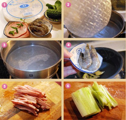 原料:越南春卷米皮3張、火腿2片、鮮海蝦3個(gè)(只是演示效果,具體數(shù)量根據(jù)需要調(diào)整)、黃瓜1段、雞毛菜數(shù)片(可省略)、薄荷葉數(shù)片、蔥姜若干、鹽少許、料酒1湯勺、泰式甜辣醬2湯勺、番茄沙司1茶匙。 做法: 1、備齊原料,海蝦去蝦腺備用; 2、鍋中倒入溫水,放入春卷皮; 3、冷水也可以,就是泡制時(shí)間可能會(huì)相對(duì)溫水久一些,一般在2-3分鐘左右; 4、取一鍋加入清水、料酒、鹽、蔥段、姜片后燒開(kāi),放入處理干凈的鮮蝦,燙至變色即可。取出放入白開(kāi)水中浸泡,待冷卻后去頭去殼; 5、火腿切成絲備用; 6、黃瓜去皮切絲備用;