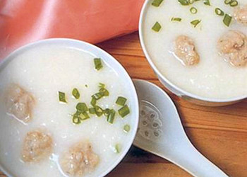 材料:米3兩(約120克),豬枚頭肉6兩(約240克),豬排骨8兩(約320克),魚蓉4兩(約160克朗,陳皮1/4個(gè),馬蹄粒、蔥粒各1湯匙,腐竹1/2兩(約20克)。 配料:腌米料:油、鹽各1/2茶匙。 腌肉料:砂糖1/2茶匙,鹽1茶匙,生粉2茶匙,澄面、胡椒粉各1/8茶匙。 做法: 1、米用清水浸片刻,去水,加入腌米料拌勻,待米發(fā)漲并呈乳白色時(shí),用匙壓碎。 2、陳皮浸軟,刮去瓤,切細(xì)。 3、豬肉切細(xì),剁蓉,加入腌肉料、魚蓉、陳皮和馬蹄,順?lè)较蛴昧嚢璩赡z狀,最后搓成小粒肉丸子,并用煮水煮熟(湯水留用)。 4、豬排骨氽水,腐竹抹凈,剪碎。 5、清水約15杯注入鍋內(nèi)燒煮,先下豬排骨和腐竹煲半小時(shí),跟著下米大火煲產(chǎn)半小時(shí),然后改慢火,注入3之煮肉丸湯水,煲成粥,最后放入肉丸煮片刻,撒上蔥粒便成。 備注:豬肉切細(xì)再剁蓉,比較現(xiàn)成絞碎的豬肉爽口和有肉味,加入魚蓉(或蝦膠)做肉丸食味更可口。