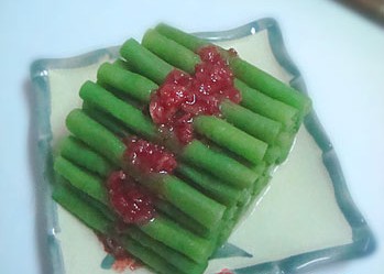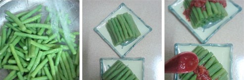 8、9、把瀝干水的豆角盛在盤中,淋上蒜蓉腐乳汁即可開吃。