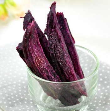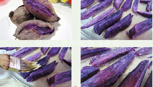 原料:紫薯3個、黃油50克、白糖10克。 做法: 1、買回的紫薯把表皮洗干凈后,放入蒸鍋中蒸熟。黃油室溫軟化。 2、晾涼后,剝?nèi)プ鲜砥,用刀切?CM寬的長條,并整齊地擺放在微波的轉(zhuǎn)盤上。放入微波爐中,低火微波4分鐘。 3、4分鐘后取出,用毛刷將軟化后的黃油均勻地涂在紫薯條的每一面上,均勻地撒上白糖。 4、再次將紫薯條放入微波爐中,換中火微波2分鐘,取出晾涼。 5、再重復(fù)刷黃油撒白糖,繼續(xù)中火微波2分鐘,直到紫薯條烘干變脆為止。