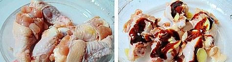 2、用照燒醬、鹽和姜片抓勻雞翅根,充分“按摩”后腌制20-30分鐘;