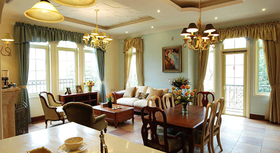 編輯點評:古典歐式的裝修風格一向以華麗的裝飾、濃烈的色彩為主,此客廳的裝飾以浪漫主義為基礎,采用了鮮明的顏色對比突出客廳的主題風格,白色的沙發(fā)、沉色的窗飾的組合搭配,設計簡單又不失華麗,淡雅又不是高貴。