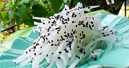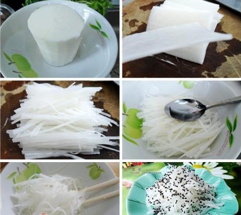 1、把蘿卜去皮切薄片,再切成絲(能切多細(xì)就切多細(xì));