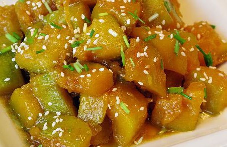 小南瓜半個(gè)(約500克)、蔥、熟白芝麻(可以用微波爐烘熟)、鹽3克、欣和醬油(六月鮮)15ml。