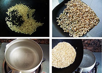 1、糙米洗干凈晾干后,入無油鍋中翻炒至黃褐色。