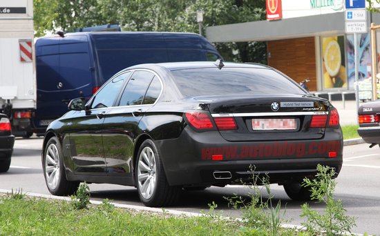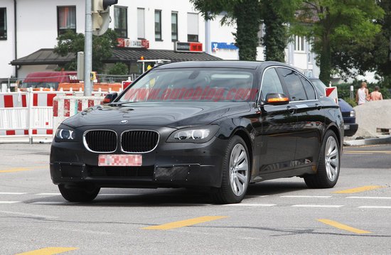 寶馬改款7系諜照 從諜照來看,改款車型與現(xiàn)款車型不會有大的造型變化,只是在細節(jié)部分會有新的設計被采納。蒙黑的頭燈中已經可以看到LED行車燈的痕跡;而導光板是否會設計成類似6系那樣的造型還無法確定,不過在6系車型中出現(xiàn)的全LED車燈預計會以選裝的方式出現(xiàn)在改款7系中,這也是首款配置全LED頭等的豪華D級車。從車身細節(jié)變化上來看,側面轉向燈已經移植到側面后視鏡上、前后保險杠部分會有少許變化,前唇稍顯突出一些,而尾箱上的擾流板設計也會有一定的變化。