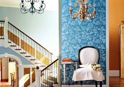 帶有漸變藍(lán)色的墻漆,如同太陽初升的天空。而這些不同層次的藍(lán)色,在同一面墻上又彼此呼應(yīng),且有條不紊,使樓道空間產(chǎn)生一種柔軟而浪漫的感覺。 藍(lán)色調(diào)的印花墻紙,清新而又寧靜,同時也是給古典式樣的椅子和吊燈增添現(xiàn)代感的別致選擇,巧妙地為房間增添了藝術(shù)氣質(zhì)。