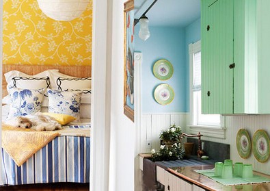 條紋、花案、描邊,這些不同圖案的床品和靠包混搭在一起,是為房間增加深度和沖擊力的經(jīng)典方法,在營造出浪漫輕松的臥室氛圍的同時,也讓房間顯得清新盎然。 純凈的湖藍色墻面,讓人在廚房工作的時候如同置身在靜謐的湖邊,而裝點上清新的綠色廚柜和餐具后,令你的心情也跟著放松下來了。