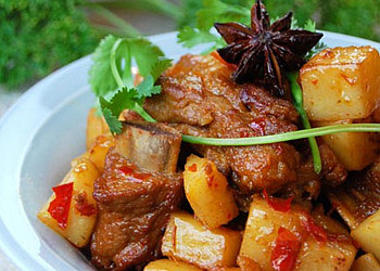 材料:豬排骨300克、土豆500克、郫縣豆瓣醬2大匙(30ml)、醬油2大匙(30ml)、料酒1大匙(15ml)、姜末15克、大料2粒、花椒10粒、糖1小匙(5g)、鹽適量、油。 做法: 1、將剁成小塊的豬排骨用沸水焯變色,洗去血沫待用,郫縣豆瓣醬剁碎待用; 2、土豆去皮切成小塊,用清水浸泡片刻,除去變面淀粉,鍋中放入1大匙(15ml)油燒熱,將土豆放入煎至金黃,盛出待用; 3、炒鍋燒熱,放入2大匙(30ml)油,放入焯過水的排骨炒至金黃; 4、放入剁碎的豆瓣醬和姜末炒勻,炒出香味; 5、加入醬油、料酒炒勻; 6、加入適量開水(沒過排骨),燒開,加入大料和花椒; 7、加蓋轉(zhuǎn)小火燒20分鐘至排骨酥爛; 8、加入煎黃的土豆塊,燒5分鐘至湯汁收干,用鹽、糖調(diào)味即可。 |