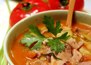 材料:番茄2個(小個的3個)、豬里脊肉200克(用牛肉、羊肉也行)、芹菜適量、西葫蘆半根(或者其他適合燉煮的蔬菜)、姜1小塊、蒜3瓣、淀粉2匙、鹽適量、番茄醬1大匙、白胡椒粉少量、黑胡椒碎少量(沒有也行)、色拉油 做法: 1、番茄去皮切小塊,芹菜洗凈切小段(葉可不去),西葫蘆洗凈切片,姜蒜切末; 2、里脊肉切薄片,用淀粉和白胡椒粉加適量水抓勻腌制片刻; 3、鍋燒熱放入適量油,放入姜蒜爆香,加入番茄塊炒軟,加入番茄醬; 4、加入適量水(能沒過番茄,有骨湯或者雞湯更好),燒開轉(zhuǎn)小火,加蓋燜至番茄爛軟; 5、加入芹菜和西葫蘆片,轉(zhuǎn)大火燒片刻; 6、加入里脊肉片滑散,變色后加鹽和黑胡椒碎調(diào)味即可。 |