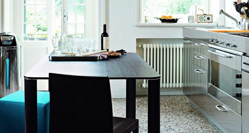 餐桌擺放在餐廳時(shí),通常會(huì)考慮色彩和材質(zhì)與周圍空間是否配搭,在廚房里,這種搭配關(guān)系依然存在。全不銹鋼櫥柜給人非常專業(yè)的感覺,搭配深木色實(shí)木餐桌,兩種材質(zhì)、兩種色彩、兩種觸感,對(duì)比中又相互調(diào)和。彩色方形凳起到點(diǎn)睛的作用。