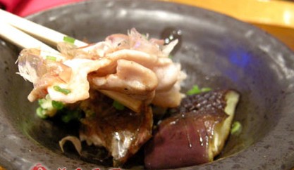 茄子2個、豬肉片100克、生姜末適量、干制鰹魚適量、小青蔥適量、鹽、胡椒、小麥粉、色拉油。