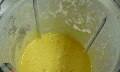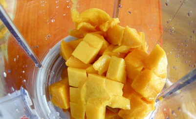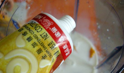 2、芒果肉和冰鎮(zhèn)牛奶倒入果汁機(jī)里,再加入40克左右的煉乳用果汁機(jī)打1分鐘即可;(煉乳超市賣(mài)奶粉的專區(qū)有賣(mài),不超過(guò)10塊錢(qián)一支)