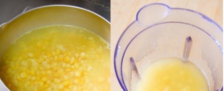 2、把玉米粒倒入鍋中,再倒入清水,大火煮開后,撇掉浮沫,改成中小火煮10分鐘左右。稍涼之后將玉米連湯汁一起倒入攪拌機(jī)中(1次倒不下就分成2次),攪打出槳;