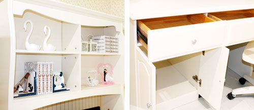 細(xì)節(jié)概述:女孩子的雜物比較多,此款書桌的收納功能非常強(qiáng)大,滿足女孩子的各類需求。上方是可以展示的開放性書架,可以放一些隨手要拿的書籍,或者裝飾品。下方有隱藏的抽屜,可以放一些私密的東西,保證女孩子的隱私。 |