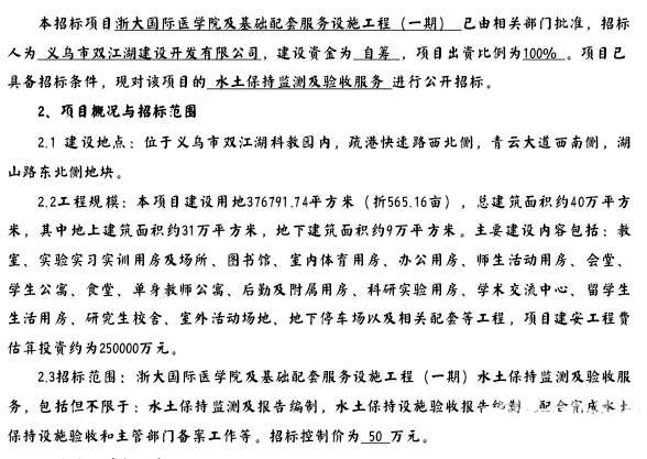 本項目位于義烏市雙江湖科教園內(nèi),疏港快速路西北側(cè),青云大道西南側(cè),湖山路東北側(cè)地塊。建設(shè)用地376791.74平方米(折565.16畝),總建筑面積約40萬平方米,其中地上建筑面積約31萬平方米,地下建筑面積約9萬平方米。主要建設(shè)內(nèi)容包括:教室、實(shí)驗(yàn)實(shí)習(xí)實(shí)訓(xùn)用房及場所、圖書館、室內(nèi)體育用房、辦公用房、師生活動用房、會堂、學(xué)生公寓、食堂、單身教師公寓、后勤及附屬用房、科研實(shí)驗(yàn)用房、學(xué)術(shù)交流中心、留學(xué)生生活用房、研究生校舍、室外活動場地、地下停車場以及相關(guān)配套等工程,項目建安工程費(fèi)估算投資約為250000萬元。 |