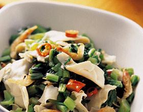 3、百葉雪菜 材料:雪里蕻300克,百葉1束(約10片)。 配料:辣椒、堿粉、鹽、雞精、香油各適量。 做法: 、1~2盆溫?zé)崴褖A粉調(diào)融,放入一片片百葉浸泡至軟,至顏色變白,撈出,反復(fù)用冷水漂洗干凈。 ②瀝干百葉后,剝成小片;雪里蕻去除莖部及老葉,洗凈,擠干水分,切成細(xì)末;辣椒洗凈,切小圈圈。 、燮鹩湾伡5大匙油.加入辣椒炒香,放入雪里敲拌炒片刻,最后放入百葉拌炒,加調(diào)味料拌勻。 瘦身小編點(diǎn)評:雪里蕻可以解毒消腫,促進(jìn)腸胃消化,所含的胡蘿卜素和纖維素還可以防治便秘。加上滋陰潤燥的百葉,最適合冬季減肥食用。