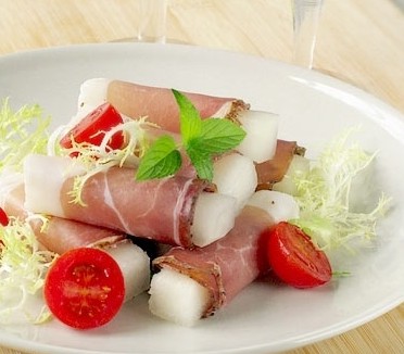 3、用意大利風干火腿片把蜜瓜條卷起放入盤中;