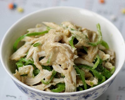 原料:雞腿一只、青椒二個(gè)、蒜一個(gè)。 調(diào)料:麻醬少許、芝麻油1茶匙(5克)、鹽1/2茶匙(3克)、生抽1茶匙(5克)、米醋1湯匙(15克)、白糖1/2茶匙(3克)。 做法: 1、雞半只洗凈后放在容器中; 2、加入水沒(méi)入雞; 3、放微波爐中,高火6分鐘取出,將雞肉撕成條狀; 4、麻醬用少許冷開(kāi)水調(diào)開(kāi); 5、青椒切成絲后,焯水; 6、將青椒絲放入容器中; 7、倒入撕好的雞絲; 8、加入其他調(diào)料拌均勻即可。 有話(huà)說(shuō): 1、天氣太熱,不想做飯,可以用微波爐來(lái)代替爐火。 2、麻醬是夏天常吃的一種醬料,可以用芝麻醬,也可以花生醬,芝麻醬各半。 3、把青椒絲換成黃瓜絲就不用微波爐了。 |