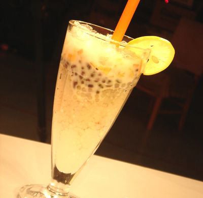 5、杯中依次放入西米、紅豆、木瓜粒、倒入椰汁加少許碎冰,用檸檬片裝飾杯子。