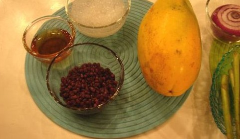 3、剩下的半個木瓜去皮,去核,切成小粒,然后用鹽水浸泡,備用;