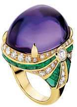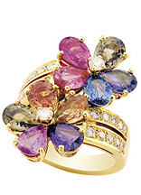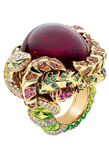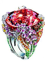 以各種自然形態(tài)而引發(fā)的想象為靈感,融合著粉色藍寶石、祖母綠、橘色藍寶石、沙芙萊石等各種色彩,打造出陽光的暖色調,天然植物的綠色調……在你的指尖中上演著一出充滿誘惑力的異域情懷。