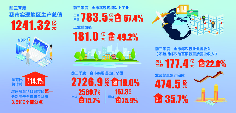 增速位居全省前列、金華各縣市區(qū)第一 進入10月,“十四五”開局進入下半程。 14.1%,分別高于全省和金華市3.5和2個百分點,兩年平均增長8.4%。前三季度義烏經(jīng)濟逆風“奮蹄”,于“變局”中謀“新局”,實現(xiàn)地區(qū)生產(chǎn)總值1241.32億元,同比增長14.1%,增速居金華各縣市區(qū)第一,全省前列,用實力證明義烏經(jīng)濟走在全省前列、對標全國、鏈接全球的信心和潛力。 這個成績,來之不易——逐季向好的經(jīng)濟上揚線,顯示迎“疫”而上的復蘇力量。 這組數(shù)據(jù),殊為珍貴——新階段新理念新格局,從“新”出發(fā),開啟“十四五”高質(zhì)量發(fā)展新征程。 縱觀三季度,疫情依舊肆虐,義烏規(guī)上工業(yè)企業(yè)依然跑出“加速度”。他們抓住國內(nèi)外疫情平穩(wěn)期,積極組織生產(chǎn)擴產(chǎn),及時“補鏈”“強鏈”,交出一份難得的成績單。據(jù)統(tǒng)計,前三季度,全市實現(xiàn)規(guī)模以上工業(yè)產(chǎn)值783.5億元,同比增長67.4%,兩年平均增長35.4%,兩年平均增速比上半年提高5.0個百分點;實現(xiàn)銷售產(chǎn)值756.6億元,同比增長63.6%,兩年平均增長35.8%,兩年平均增速比一季度提高4.9個百分點。前三季度,全市實現(xiàn)規(guī)模以上工業(yè)增加值181.0億元,同比增長49.2%,增速位居金華各縣市區(qū)第一,兩年平均增長25.6%。 內(nèi)外挑戰(zhàn)并存、形勢復雜多變,這是今年外貿(mào)進出口面臨的大環(huán)境;得益自貿(mào)試驗區(qū)、綜合保稅區(qū)、跨境電商綜試區(qū)、進口貿(mào)易促進創(chuàng)新示范區(qū)等政策疊加,義烏外貿(mào)進出口企業(yè)以改革為帆,以貿(mào)易為槳,乘風破浪,卻是今年外貿(mào)進出口的主基調(diào)。 “上半年,我們銷售額已達到1.2億美元,比去年同期增加了50%。目前來看,四季度能超額完成年度目標!眱(yōu)闔(義烏)商貿(mào)有限公司相關(guān)負責人吳斌一臉輕松地告訴我們,近期正在籌建第三個倉庫,“我們的倉庫從最初70個平方米的小店面,擴展到目前的1.2萬平方米,預計年底肯定要爆倉,亟待擴倉! 如今,優(yōu)闔有1/3的業(yè)務通過“市場采購+跨境電商”新模式出口,利用美森快船節(jié)省了一半的物流時間,“通過‘義新歐’中歐班列,下一步我們計劃大規(guī)模開辟歐洲市場!眳潜笳f,義烏完備、便捷、高效的貿(mào)易生態(tài)鏈具備強大競爭優(yōu)勢,可以助力企業(yè)以最高效率、最低成本打開全球市場。 前三季度,義烏市場忙碌的可不止優(yōu)闔一家企業(yè),背后還有千千萬萬個市場經(jīng)營主體遨游在國內(nèi)國際“雙循環(huán)”海洋之中。 一組數(shù)據(jù)可以佐證:前三季度,全市實現(xiàn)進出口總額2726.9億元,同比增長18.0%,較去年同期提高12.2個百分點;其中出口2569.7億元,同比增長15.7%,較去年同期提高10.6個百分點;進口157.3億元,同比增長75.9%,增速較上半年提高4.3個百分點,較去年同期提高50.1個百分點。 “空氣中都飄著商機!边@是境內(nèi)外客商對義烏最直觀的評價。 義烏這片沃土,新興產(chǎn)業(yè)蓬勃發(fā)展,這從一組數(shù)據(jù)可以體現(xiàn),前三季度我市數(shù)字經(jīng)濟核心產(chǎn)業(yè)制造業(yè)、高端裝備制造業(yè)、節(jié)能環(huán)保制造業(yè)、裝備制造業(yè)、戰(zhàn)略性新興產(chǎn)業(yè)、高新技術(shù)產(chǎn)業(yè)增加值分別同比增長183.2%、164.2%、155.7%、133.5%、103.6%、74.4%,均高居金華各縣(市、區(qū))首位。同時,前三季度義烏科創(chuàng)力度不斷加大,研發(fā)投入逆勢增長,規(guī)模以上工業(yè)企業(yè)研發(fā)費用增長58.3%,較去年同期提高39個百分點,兩年平均增速為37.4%。有新產(chǎn)品生產(chǎn)的企業(yè)數(shù)為431家,占規(guī)模以上工業(yè)企業(yè)的58.2%。 義烏是“世界超市”,也是“全國網(wǎng)商集聚中心、全球網(wǎng)貨營銷中心、跨境電子商務高地”,憑借貨源組織和產(chǎn)業(yè)支撐的競爭優(yōu)勢,義烏快遞行業(yè)迎來爆發(fā)式增長。前三季度全市快遞服務企業(yè)業(yè)務量累計完成654058.4萬件,同比增長38.4%,繼續(xù)位居全國第二;業(yè)務收入累計完成169.2億元,同比增長24.3%。同期,義烏全市郵政行業(yè)業(yè)務收入(不包括郵政儲蓄銀行直接營業(yè)收入)累計完成177.4億元,同比增長22.8%;業(yè)務總量累計完成474.5億元,同比增長35.7%。 “義烏快遞業(yè)是全國快遞業(yè)的風向標!绷x烏快遞行業(yè)協(xié)會相關(guān)負責人介紹,近幾年,全國各地的快遞行業(yè)協(xié)會紛紛來義烏調(diào)研學習。這里快遞企業(yè)數(shù)字化程度高,價格優(yōu)勢明顯、科技投入力度大,為暢通循環(huán)、助力生產(chǎn)、促進消費、便利生活作出了積極貢獻,也是他們學習的榜樣。 跑贏上半場,發(fā)力下半程,義烏經(jīng)濟就像一艘遠航的巨輪,在高質(zhì)量發(fā)展的航道上乘風破浪,駛出新篇章。 |