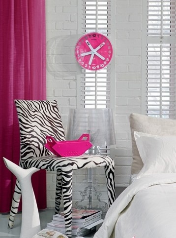 狂野味十足的斑馬紋座椅和白色床品形成鮮明對比,如果覺得太過粗獷,不妨給墻面掛一款甜美味十足的粉色鐘表,會給臥室增添幾份柔美氣息。