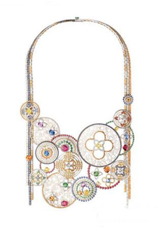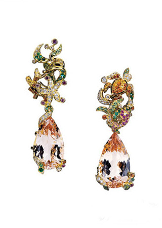 婚禮秀場(chǎng)的絕對(duì)主角:Dior高級(jí)珠寶系列MER耳環(huán) 大克拉的摩根石分別與橘色藍(lán)寶石、粉色藍(lán)寶石和沙弗來石組合,黃金和鉑金也共舞其中,大克拉的主石十分罕見,設(shè)計(jì)語言豐富。