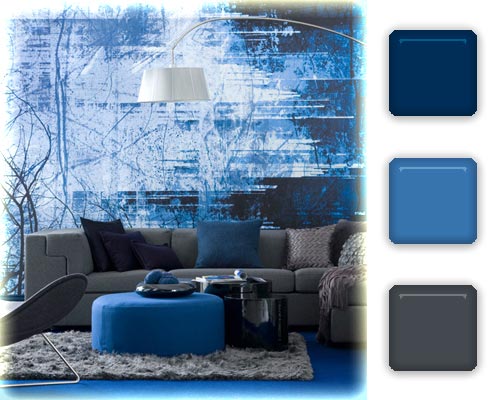搭配點評:不同深淺的藍色搭配現(xiàn)代感十足的家具設計,完美得體現(xiàn)了“COOL”的感覺,簡潔、時尚。背景墻潑墨風格的設計十分具有沖擊力。