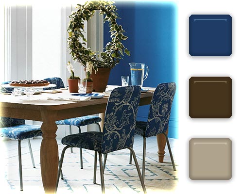 搭配點評:藍色裝飾搭配原木色家具再加上綠色植物,寧靜的海濱風情躍然于眼前。藍色墻壁、藍色餐椅、藍色格紋地毯使同樣的色彩變化出不同的層次。