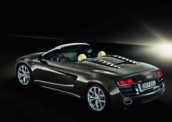 奧迪R8 Spyder 性能 奧迪R8 Spyder超級敞篷跑車采用中置發(fā)動機布局形式,配備奧迪FSI燃油直噴技術(shù)的5.2升V10發(fā)動機被精心安裝在ASF輕量化車身的中間位置,R tronic手動/自動一體式順序變速箱和quattro全時四輪驅(qū)動系統(tǒng)負責將動力傳輸至地面。