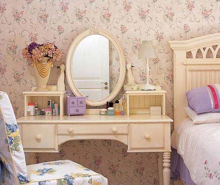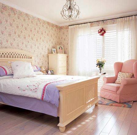 麥芽黃為底的壁紙上,粉花綠葉的花朵圖案大方自然地鋪卷著,與原白色仿木家具、水晶調(diào)燈組合出另一種溫馨浪漫。而粉色沙發(fā)、淺紫色床品以及玫瑰插花、花球的點(diǎn)綴更給這間閨房增添了些嬌柔嫵媚的氣質(zhì)。