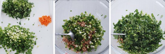 3、香菜和香蔥切成碎末,胡蘿卜切小碎屑; 4、烤好的辣椒去蒂,同樣用蒜臼子碾成泥,然后把所有材料都放入容器里,加鹽,生抽,醋,香油拌勻即可。