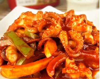 小章魚、青椒、彩椒、姜絲、韓式辣醬1大勺、鹽少許、糖少許、醋精少許。