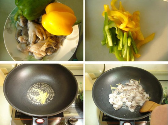 1、小章魚清洗干凈,青椒彩椒切條;