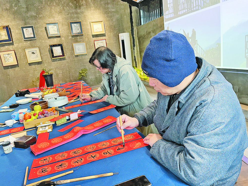 現(xiàn)場(chǎng)創(chuàng)作氛圍濃厚 智者樂水,仁者樂山。近日,西泠印社文化藝術(shù)聯(lián)合棲隱大安主辦的“尋隱大安——當(dāng)代名家山中記事系列活動(dòng)”在赤岸鎮(zhèn)棲隱大安旅居小鎮(zhèn)半山民宿舉行。 熱情似火的紅紙“!弊,精心手寫的新年掛歷,寓意吉祥的喜慶對(duì)聯(lián),有序展陳的20多幅藝術(shù)精品……當(dāng)天,在棲隱大安活動(dòng)現(xiàn)場(chǎng),許多精心創(chuàng)作的優(yōu)秀字畫作品被一一展出,金心明、吳浩、余九一、章旭、陳經(jīng)等藝術(shù)家齊聚一堂,愜意地傾情創(chuàng)作。他們或?qū)懽之嫯,或交流藝術(shù)靈感,或切磋藝術(shù)手法。 活動(dòng)當(dāng)天,幾位藝術(shù)家還踱步至山中景觀亭,即興發(fā)揮現(xiàn)場(chǎng)合作完成了一幅棲隱大安山水畫。從最初的粗略線條,變?yōu)闅鈩?shì)磅礴的山水人文圖,藝術(shù)家們精湛的藝術(shù)手法令人驚嘆。現(xiàn)場(chǎng),還有西泠印社工作人員通過手機(jī)直播間,將藝術(shù)家們的創(chuàng)作過程分享給網(wǎng)友,他們的作品也通過西泠印社直播間進(jìn)行拍賣。 “所有藝術(shù)家在現(xiàn)場(chǎng)創(chuàng)作了三四十件作品,基本以大安山水、義烏古詩詞、新年祝詞等內(nèi)容為主,貼合自然與當(dāng)?shù)仫L(fēng)俗。也希望通過這樣的形式,將不同的生活狀態(tài)美學(xué)分享出去,將義烏人文歷史發(fā)揚(yáng)光大!闭憬ㄑ芯繒(huì)副主席金心明說。 |