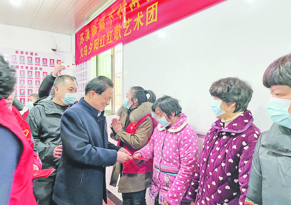 “來(lái)來(lái)來(lái),每人20斤大米,10斤花生油。祝你們?cè)诹x烏溫馨過(guò)年!1月24日,蘇溪鎮(zhèn)殿下村服務(wù)中心內(nèi),人聲鼎沸,笑語(yǔ)喧天。在市老年體協(xié)的牽頭組織下,由體協(xié)旗下的夕陽(yáng)紅藝術(shù)團(tuán)與愛心人士樓有德組織的“愛心小分隊(duì)”,前來(lái)慰問(wèn)殿下村“留義過(guò)年”的外來(lái)建設(shè)者。 當(dāng)日,殿下村約有170余名“留義過(guò)年”的外來(lái)建設(shè)者領(lǐng)取了慰問(wèn)品。此外,樓有德還給村里的5戶困難家庭每戶送上1000元的慰問(wèn)金。 |