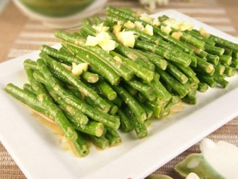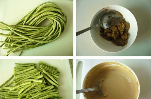 原料: 豇豆8兩、蒜3瓣、芝麻醬、鹽、雞精、醋、糖水、五香辣油、油。 做法: 1、豇豆清洗干凈,去掉兩頭,切成小段; 2、鍋內(nèi)燒開(kāi)水,放少許鹽,幾滴油,放入豇豆焯至呈翠綠色; 3、撈出豇豆浸入事先準(zhǔn)備好的冰水中; 4、取碗,放入芝麻醬,加入水和少許鹽,將醬澥開(kāi),再加入、糖、雞精、醋,五香辣油(做法見(jiàn)麻辣海鮮香鍋 )拌勻; 5、豇豆淋干水份倒入醬汁,加入蒜碎,拌勻即可。