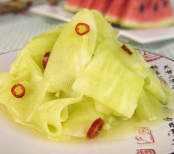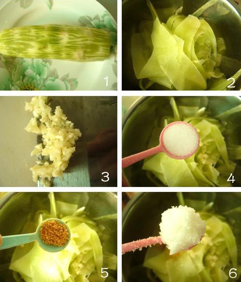 萵筍一節(jié)、蒜一瓣、小紅椒1根、鹽一小勺、糖一大勺、牛肉粉一小勺、醋精半小勺、香油半小勺。