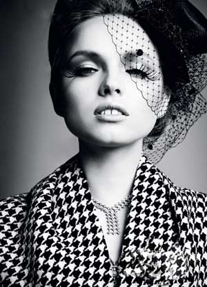 纖長(zhǎng)的睫毛在精致肅穆的黑色蕾絲帽飾遮掩下, 不經(jīng)意地釋放著優(yōu)雅冷靜的睿智,搖曳在頸間的鉆石項(xiàng)鏈閃爍出別樣的迷離風(fēng)情。