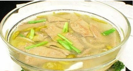 2、往鍋里加清水適量、旺火煮沸后,加入韭菜及豬肝,煮至豬肝熟,即可調味食用。
