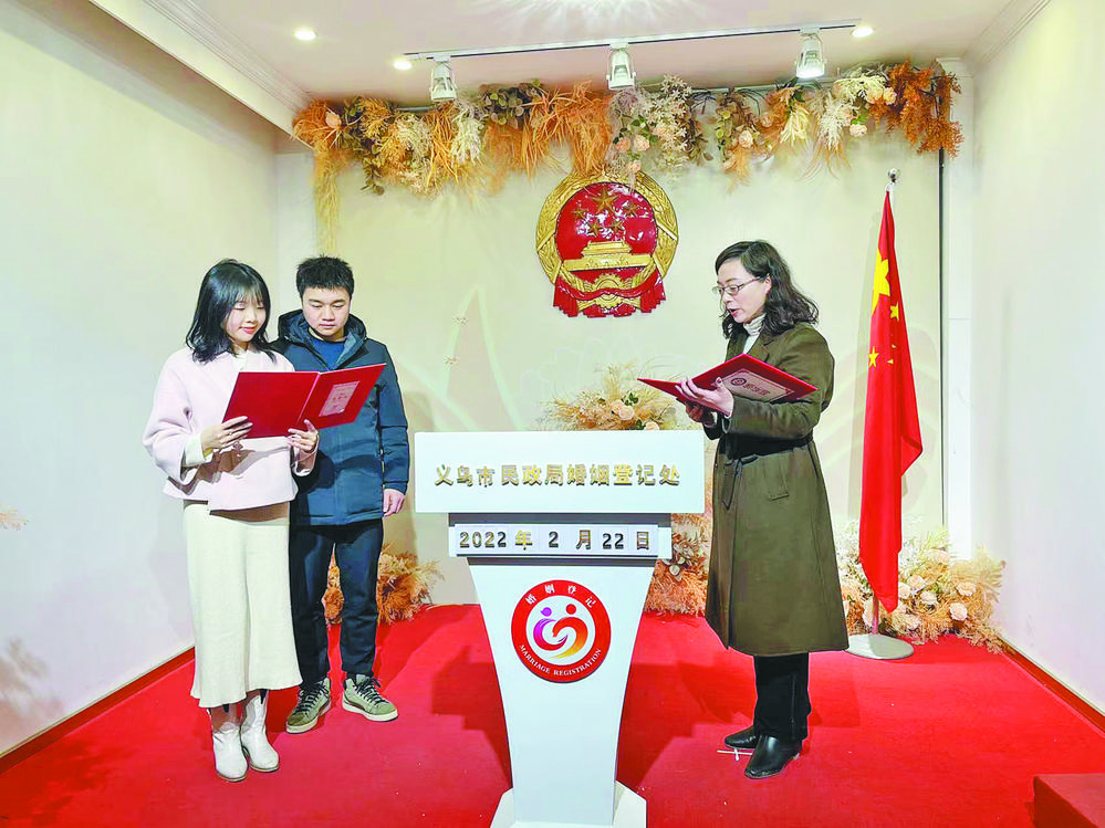 因“2”諧音“愛”,2022年2月22日被不少網(wǎng)友稱之為最有“愛”的日子。在義烏,許多新人選擇在這一天結(jié)婚登記,為“領(lǐng)證”增添儀式感。有新人凌晨5點就在婚姻登記中心門口排隊,也有新人表示,“兩年前就看好了這個日子,今天解鎖新的角色,感到非常幸福。” 記者從市民政局婚姻登記中心獲悉,2月22日當(dāng)天的婚姻登記預(yù)約量達115對,是日常預(yù)約量的3倍。全天共辦理婚姻登記165對。 一上午辦理結(jié)婚登記68對 連日來,受雨雪冰凍天氣影響,義烏持續(xù)低溫陰雨天氣。天氣雖冷,前來進行婚姻登記的情侶卻熱情不減,滿滿的愛和甜蜜溫暖了商城。 上午8時許,市婚姻登記中心提前半個小時開門迎客,已有十幾對新人排隊等候。準(zhǔn)新人嚴(yán)格執(zhí)行疫情防控工作要求,掃碼測溫有序排隊入場,盡管戴著口罩,也藏不住新人幸福的笑意。登記中心門口早已設(shè)置了浪漫的“氣球門”,將甜蜜的氛圍“拉滿”。 “我們自愿結(jié)為夫妻,從今天開始,我們將共同肩負起婚姻賦予我們的責(zé)任和義務(wù)……”在頒證大廳,侯女士和何先生在特邀頒證嘉賓的帶領(lǐng)下誦讀結(jié)婚誓詞。莊重而神圣的頒證儀式,賦予這對新人婚姻以別樣的厚重感,讓新人更加敬重婚姻、更加敬重對方。采訪中,他們也高興地分享了生活中與“2”這個數(shù)字特別的緣分。 “我們?nèi)ゲ蛷d吃飯會排號經(jīng)常排到222號,我們家庭住址是22號,我的寵物名叫‘22’,我的手機尾號還是222,今天正好是2022年2月22日。”侯女士說,他們在認識一個月的時候,就決定在這個日子領(lǐng)證。 葉女士跟傅先生早上8點多就在市婚姻登記中心的門口排隊等候了,他們擇日結(jié)婚的時候了解到“2月22日”的特殊意義,提前一個月預(yù)約了這一天辦理結(jié)婚登記。“我們在去年訂婚,當(dāng)時就決定了今年的2月22日登記結(jié)婚,即使后來我懷上了寶寶,也沒有考慮更換日期!比~女士如今已有7個月的身孕,在她看來,結(jié)婚是一諾千金的事情,認準(zhǔn)了,就堅定不移。 記者了解到,截至昨日上午11時,市婚姻登記中心已辦理婚姻登記68對。 主題活動給新人更多儀式感 為新人贈送玫瑰花和福利彩票、“一生一世,與愛同行”婚前教育沙龍、新人代表宣讀《婚事新辦倡議書》、現(xiàn)場與義烏非遺傳承人制作剪紙版冰墩墩、新人DIY自制手工燈籠……為了給新人增加儀式感和浪漫感,除了莊重的頒證儀式,當(dāng)天,市婚姻登記中心聯(lián)合市福利事業(yè)發(fā)展中心精心準(zhǔn)備了“愛義綿長,佳偶天成——福彩與愛同行”主題活動,讓新人在領(lǐng)證結(jié)束后留下他們幸福美好的時刻。 為了做好高峰日婚姻登記工作,義烏市婚姻家庭協(xié)會組織招募12名志愿者協(xié)助婚姻登記中心做好疫情防控、人員疏導(dǎo)和服務(wù)指引等工作,市婚姻登記中心上午提前半小時上班,根據(jù)實際情況延長辦公時間,對已經(jīng)預(yù)約且提交資料的當(dāng)事人進行材料預(yù)審,減少當(dāng)事人現(xiàn)場等候時長,確保滿足市民婚姻登記需求。 “希望通過我們的努力,進一步增強婚姻登記的儀式感和神圣感,引導(dǎo)新人建立和維護平等、和睦、文明的婚姻家庭關(guān)系,感悟銘記婚姻家庭蘊含的責(zé)任擔(dān)當(dāng)。”市婚姻登記中心主任龔君婷表示,將進一步推動婚俗改革,倡導(dǎo)婚事新辦,弘揚文明新風(fēng),用心培育相親相愛、向上向善的家庭美德,以家庭和諧促進社會和諧。 此外,市婚姻登記中心還溫馨提醒,準(zhǔn)新人們可以合理規(guī)劃婚姻登記日期,避開登記高峰期,避免扎堆登記,即使沒有預(yù)約上,也不要遺憾,只要感情好,每天都是好日子。 |